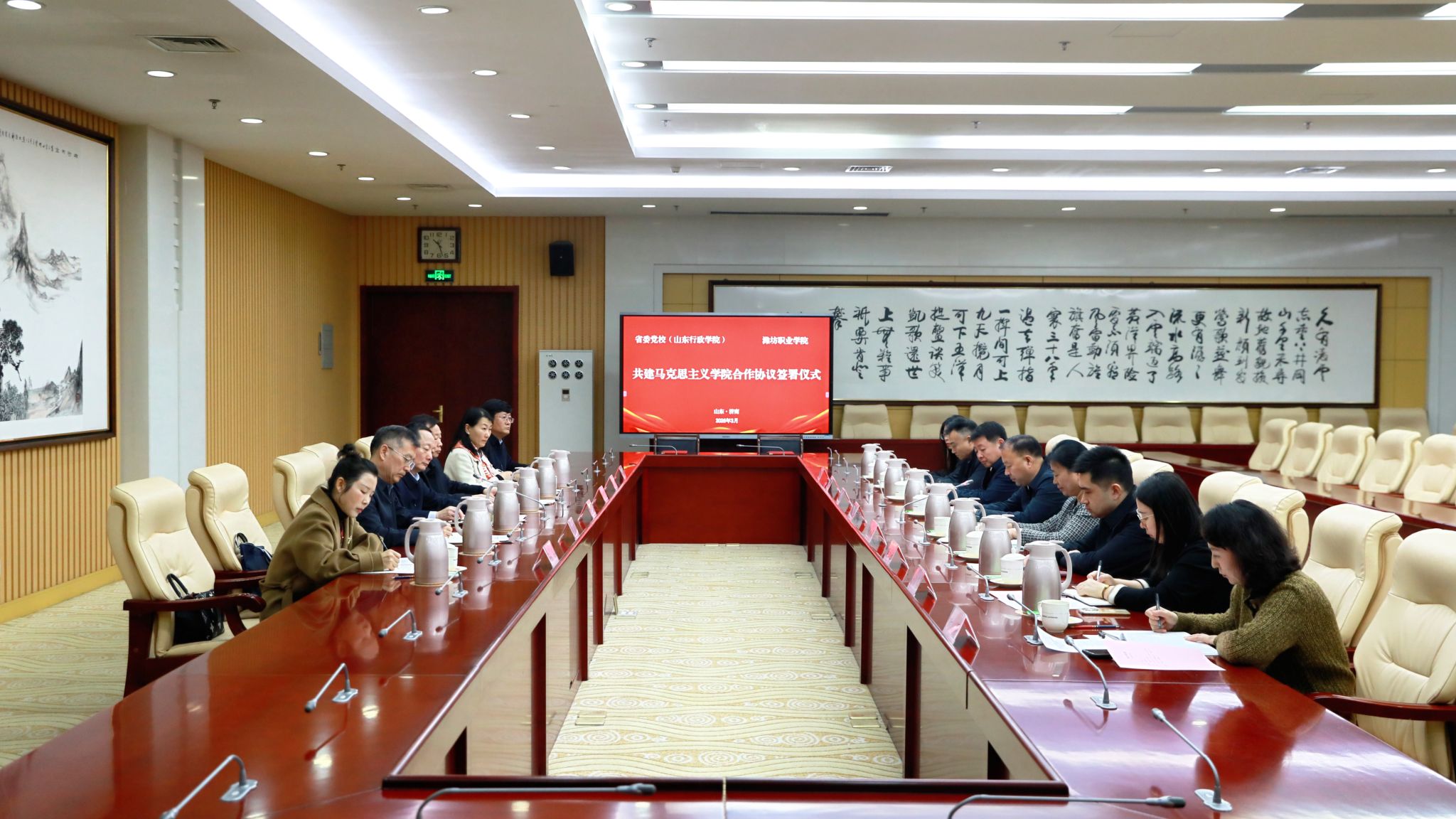 3月11日,学院党委书记王浩带队到中共山东省委党校(山东行政学院)签署共建马克思主义学院合作协议。中共山东省委党校(山东行政学院)主持日常工作的副校(院)长白皓会见王浩一行,党委副书记贺志强代表学院签订合作协议,党委委员、副院长任培华,党委委员、办公室(统战部)主任(部长)刘志艳出席签约仪式,教师工作部、马克思主义学院负责同志参加活动。
